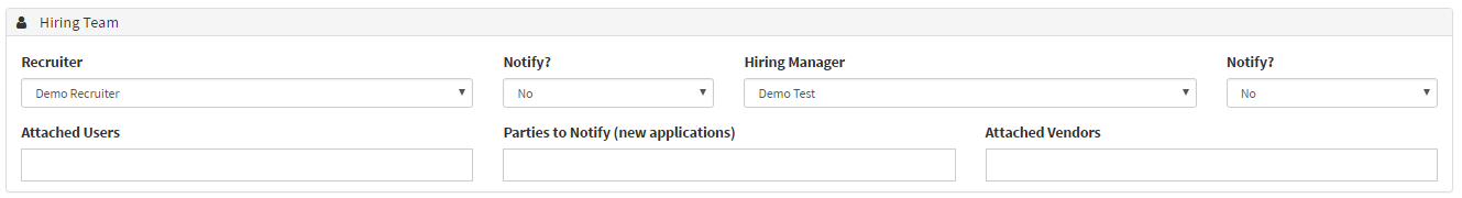- In the Hiring Team section, this is where you manage the Attached Users, Parties to Notify, and Attach Vendors.