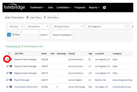 - Once you have found a job requisition click on the small “Notepad” Icon to edit the job. (outlined below)