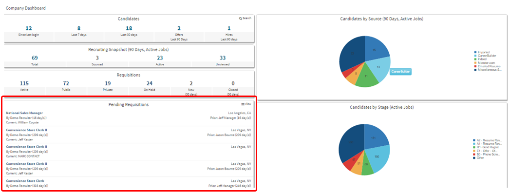 Located on the right side of the Company Dashboard, these visual summaries give further insights into recruiting trends: