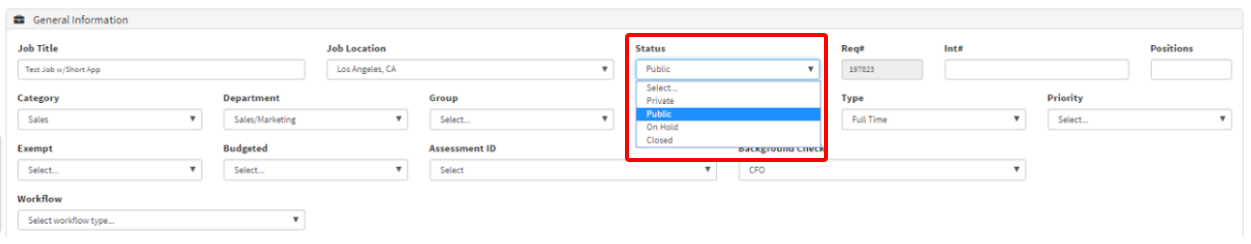 - This dropdown allows you to select if you want the status of the job to be private, public, on hold, or closed.
