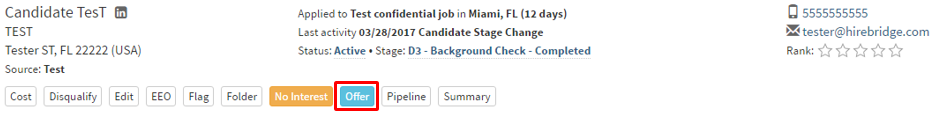First on the candidate profile overview page select "Offer"