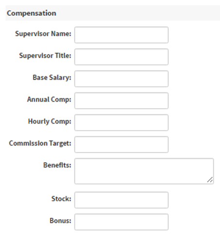 Compensation - This section allows you to enter candidate supervisor information and compensation. Along with bonus benefits, commission target number, stock number, and bonus.
