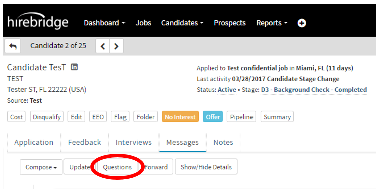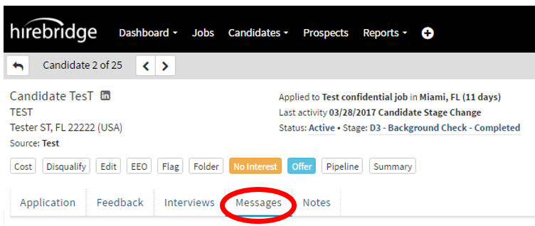 - Once you are in the candidate profile select the "Messages" tab.