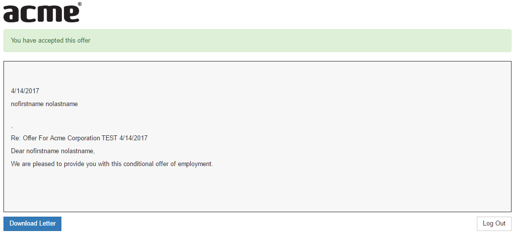 - Once the candidate has accepted the offer there will be a notification at the top stating "You have accepted this offer" and the candidate will be able to download this offer letter at the bottom left of the page.