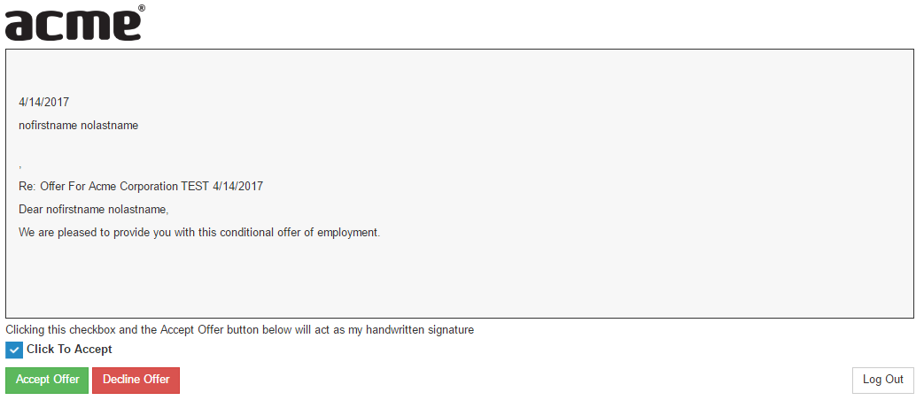Note: Based on settings the candidate will either have to sign or click a checkbox to accept or decline offer