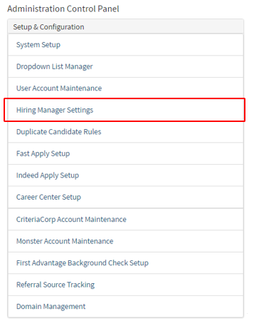 - Once on the "Administration Control Panel" under the "Setup & Configuration" select "Hiring Manager Settings".