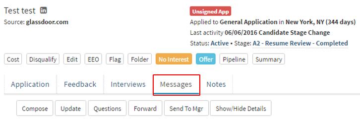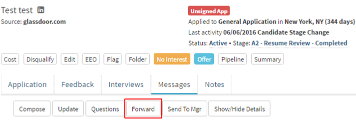 - After selecting the "Save" button you will return to the candidate profile page. In the Messages tab, the resume forward will also be recorded. (Shown in the picture below)
