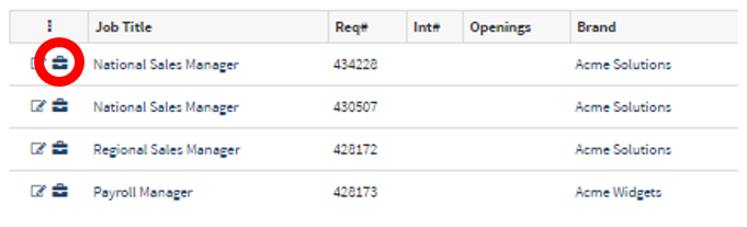 Accessing Job Overview: Identify the briefcase icon next to each job requisition title. Clicking this icon leads you to the job overview page, which is central to managing the recruitment process for each position.