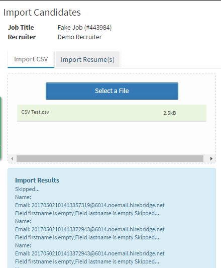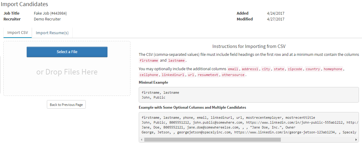 - Two ways to import candidates are either through CSV or Resume(.doc, .docx, .htm, .html, or .pdf).