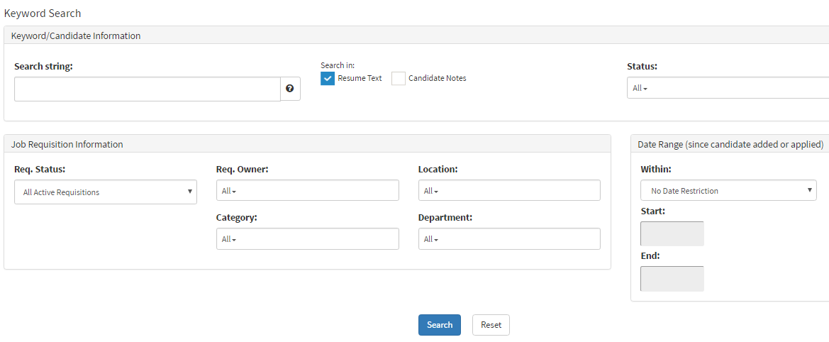 The Keyword Search Generator allows you to customize your candidate search based on keywords found in resumes, cover letters, and internal notes.