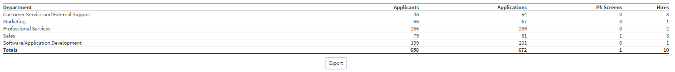 The tables and charts will include a sum of the applicants, applications, assessments (if you are enabled for them), phone screens, interviews, hires, and offers (except that the phone screens, interviews, hires, offers, and assessments columns will be individually hidden if their sum is 0).