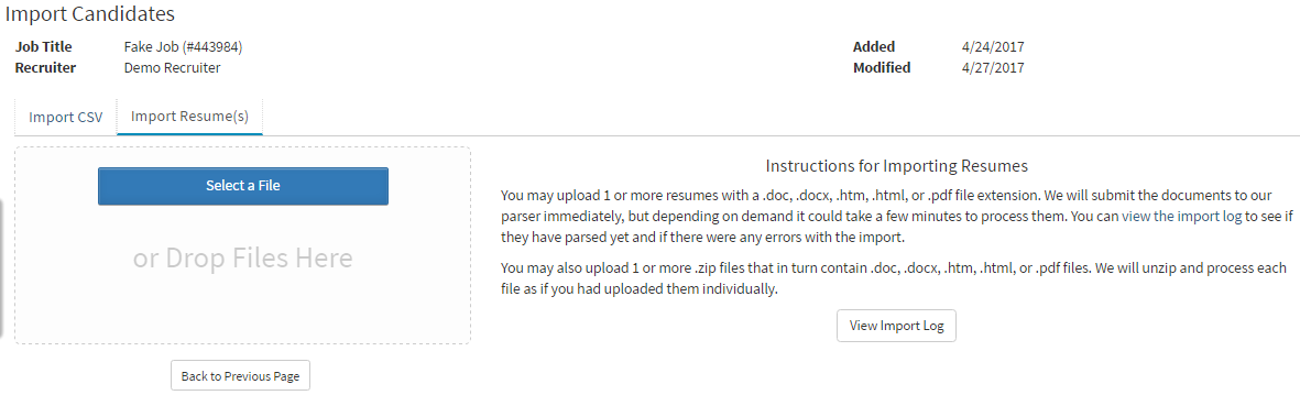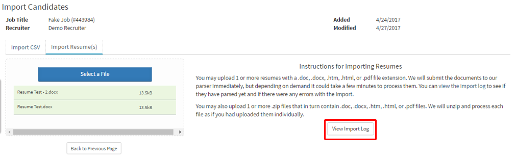 - To view what resumes you have uploaded simply select the "View Import Log"