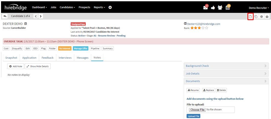 - Once in the candidate profile, a quick way to view the resume is by selecting the single paper icon on the top right corner. (Outlined in the picture above in red)