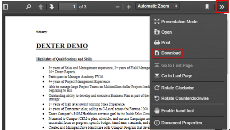 - To download the resume in the pop-up, select the three arrows on the top right. (Pictured below)