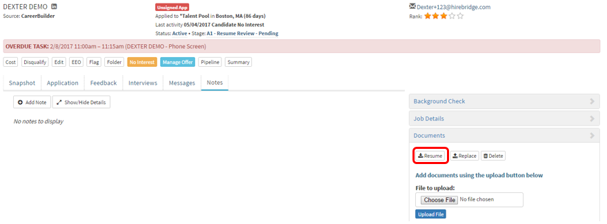 The second way to download a candidate resume is by selecting the "Document" tab on the right side of the candidate profile.