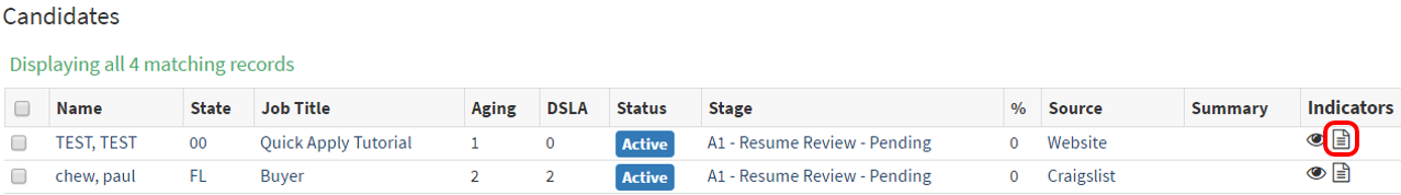 - The image below is a candidate list, on the right of the list is the "Indicators" column. The paper icon in the Indicator column lets you know if the candidate has an original resume.