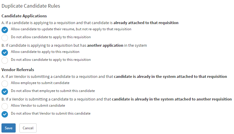 You’ll be directed to the Duplicate Candidate Rules page where you can manage settings for both Candidate Applications and Vendor Referrals.