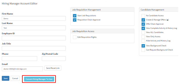 - Outlined below at the bottom is where you can select "Convert Hiring Manager To User".