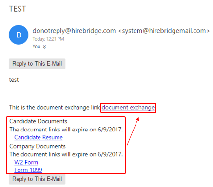 - Once the candidate has downloaded the documents and filled them out correctly they can select the "Document Exchange" link to upload the document into the Hirebridge system.