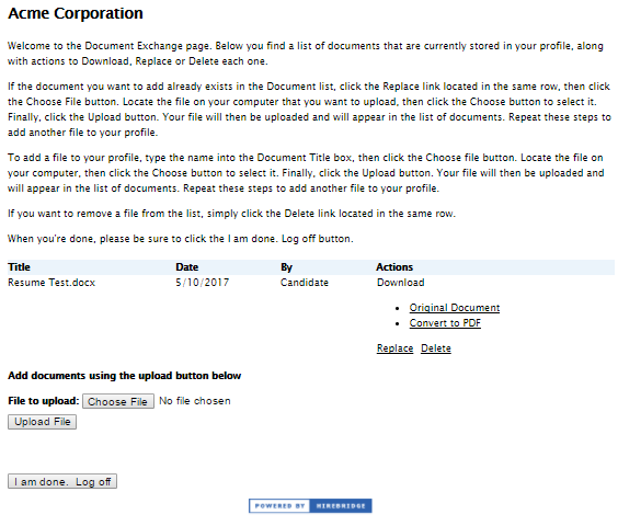 - Once the candidate has finished uploading the document they select the "I am done. Log off" button.