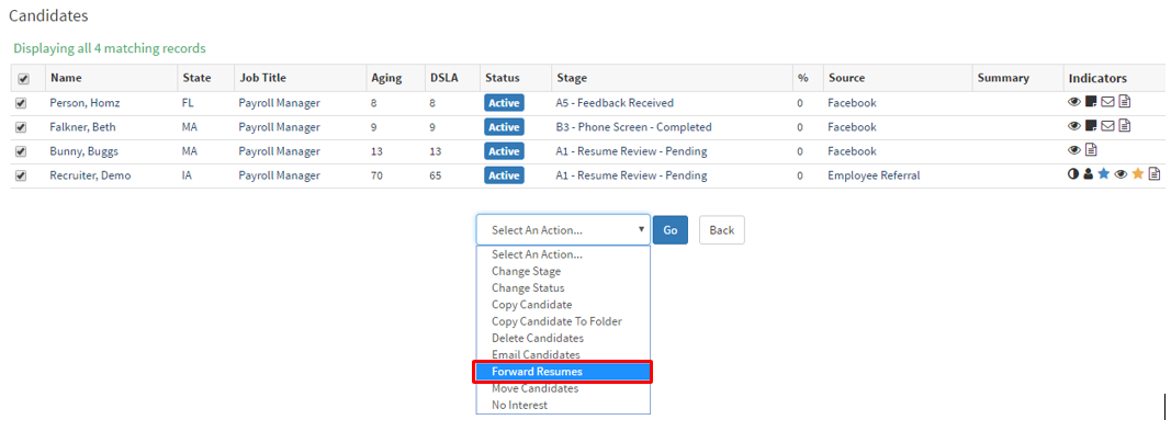 - Once you have selected the candidates you would like to bulk action.