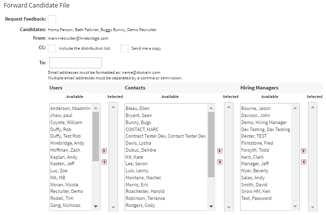 - To forward the candidate to individuals, you need to move either the Users, Contacts, and Hiring Managers from the available column into the selected column.