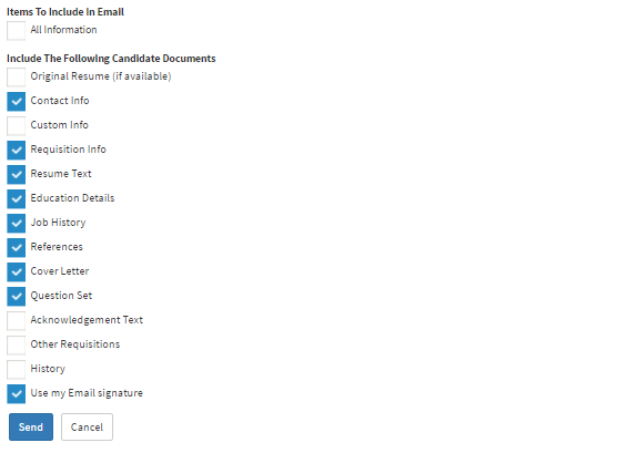 At the end of the page, there is a list of documents that you would like to include when you forward the candidate. You can either select the "All Information" check box or check each individual document you would like to include with the candidate.