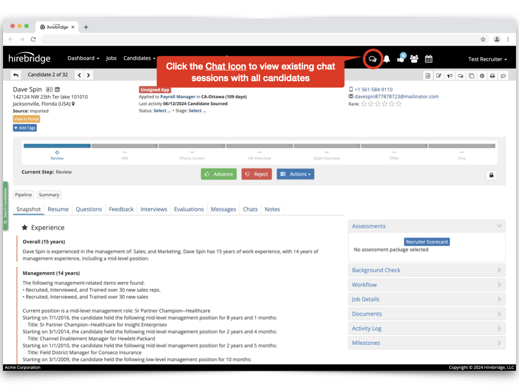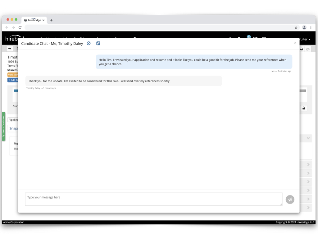 - Ease of Use: Candidates can respond to chat requests with a simple click, entering a familiar chat interface that facilitates comfortable and efficient communication.