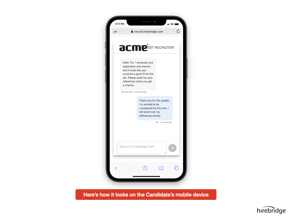 Here's how it looks on the candidate's mobile device. They can read and send messages directly to you from this screen: