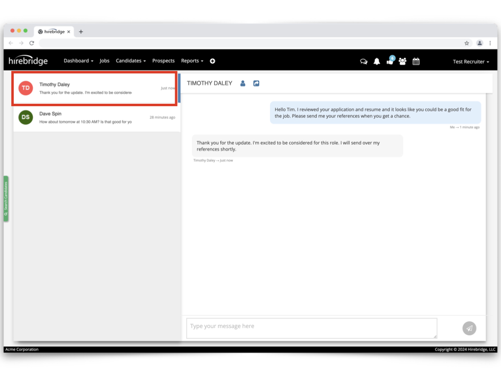 A window will open containing threaded messages for that conversation. You can read and send messages directly to the candidate from this screen:
