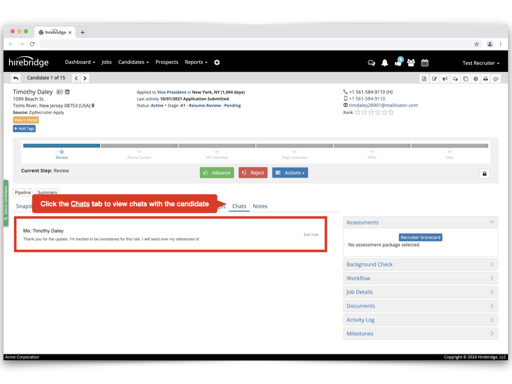 A new tab will open and your chats will be organized by candidate name. Click the Candidate's Name to view the chat thread for that conversation: