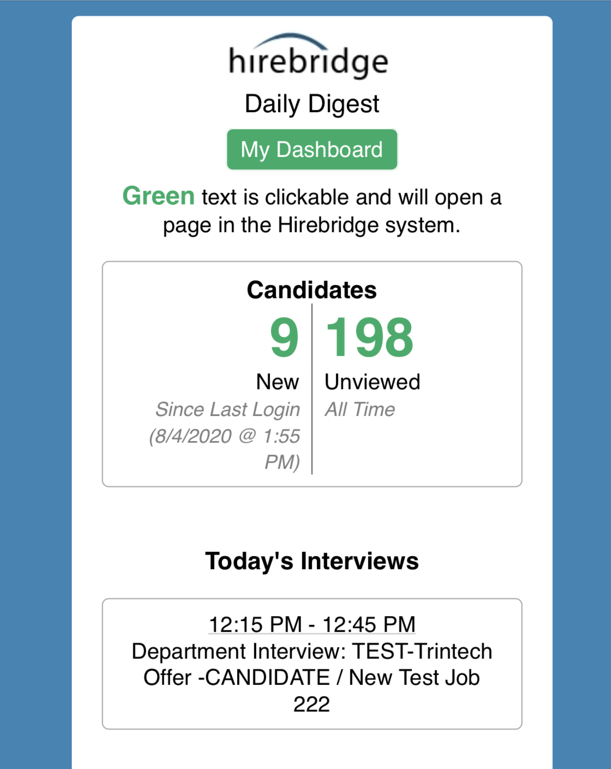 - The Daily Digest is sent to the email address associated with your Hirebridge account, ensuring you stay updated without needing to log in to the platform.