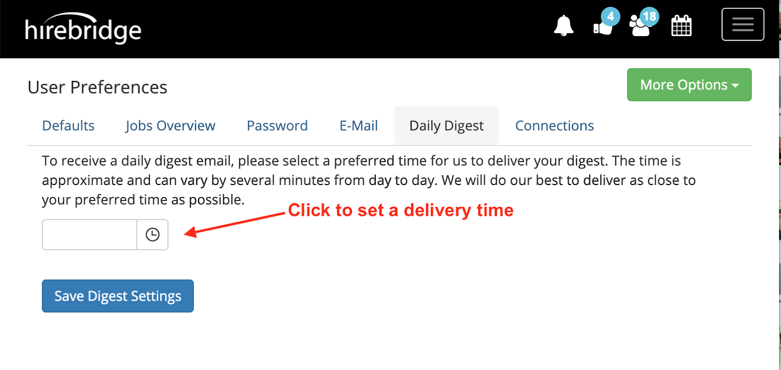 You can easily customize the time you wish to receive your Daily Digest by adjusting your preferences in Hirebridge.