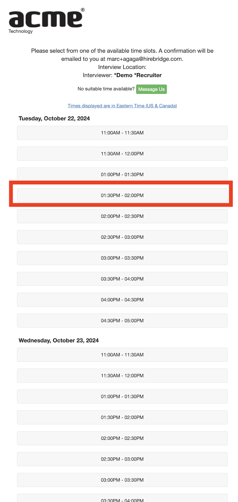 - After a candidate clicks on the link they will receive a page with available interview dates and times.